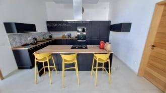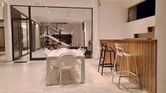 Un séjour de 90m2 avec cuisine ouverte équipée et aménagée, donnant sur une grande terrasse couverte avec un bar.