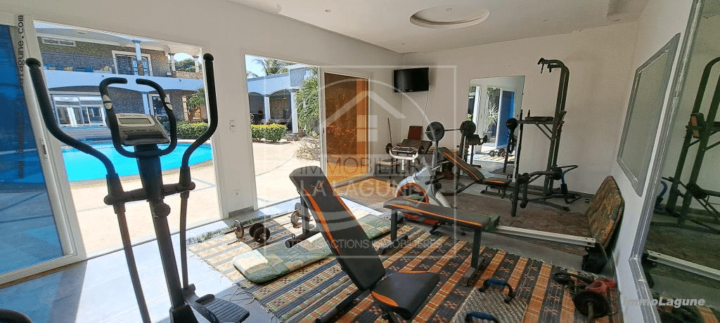 Une salle de sport de 40m2 face à sa piscine. Pool house équipé, cuisine sénégalaise.